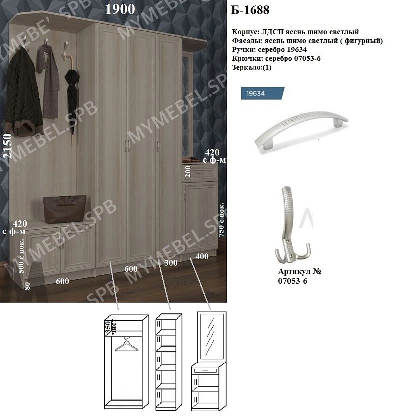 Слева щит с крючками: ш600 (3 крючка сверху на щите), снизу тумба в500 с цоколем: 2 фасада \ крыша модуля скошена по фото\